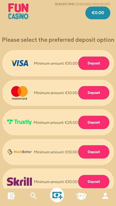 赌场的银行系统非常可靠,玩家可以通过Visa、MasterCard、Paysafecard、Skrill、Neteller、ecoPayz、GiroPay、Zimpler和比特币存取款。奖金的等待时间为24小时,但很快就会支付。每日奖金限额为5,000欧元,这有点令人遗憾。