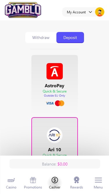 正如我们提到的,这是一家接受加密货币的赌场,因此玩家可以使用收银台提供的各种加密货币支付方式,或仅限特定品牌发行的支付卡。不提供电子钱包银行服务。