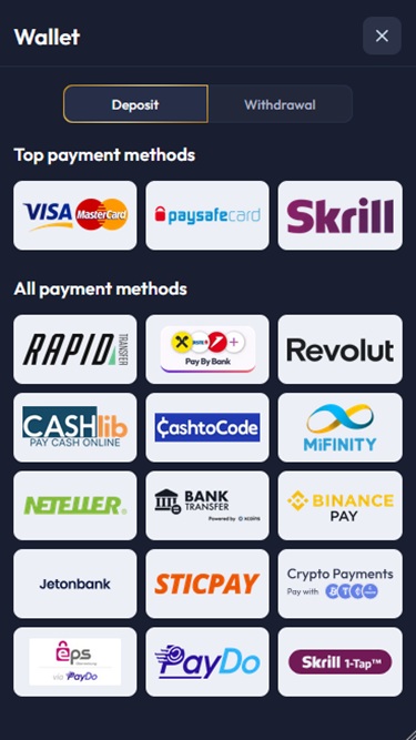 正如我们之前提到的,这是一个对加密货币友好的在线博彩品牌。除了银行电汇、借记卡、信用卡和电子钱包等常用支付方式外,玩家还可以使用各种流行的加密货币,这些货币通常交易处理速度很快。