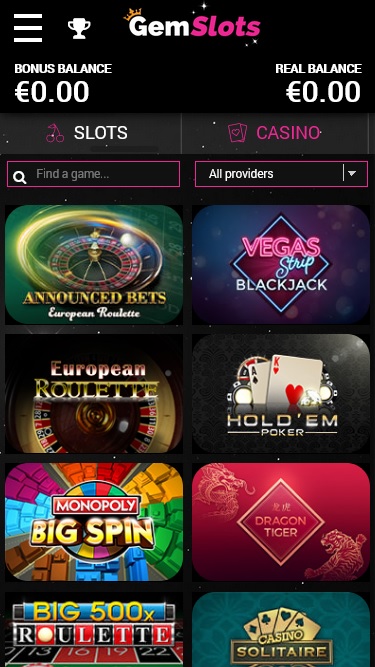 GemSlots 赌场由 Microgaming, Net Entertainment, BetSoft, 1x2gaming, Big Time Gaming, ELK Studios, Evolution Gaming, EYECON, Genesis Gaming, Habanero Systems, lightningboxgames, Play'n GO, playson, Quickspin, Rabcat, Rival, Thunderkick, Vivo Gaming, Wazdan, Booming Games, Pragmatic Play, Nolimit City, LuckyStreak, Spinomenal, Skillzzgaming, Fugaso, Fantasma Games, Kalamba, Revolver Gaming, Triple Edge Studios, Northern Lights Gaming, Evoplay, Stormcraft Studios, Switch Studios, All41 Studios, TVBet, Gameburger Studios, Pulse 8 Studios, Neon Valley Studios, Super Spade Games, SpinPlay Games, Games Global, 2by2 Gaming, Blueprint Gaming, Games Warehouse, NextGen, ProgressPlay, Tom Horn Gaming, Inspired Gaming, Genii, CORE Gaming, Scientific Games, Iron Dog Studio, Foxium, Betdigital, Just For The Win, PearFiction Studios, Slingshot Studios, Fortune Factory Studios, Crazy Tooth Studio, ReelPlay, Alchemy Gaming, SimplePlay, Gold Coin Studios and Half Pixel Studios提供支持,其游戏通过基于网页的即时游戏平台提供,可通过您常用的浏览器直接加载。这样一来,您无需下载任何繁琐的软件。此外,我们还提供移动端游戏,方便您在智能手机或平板电脑上畅玩游戏。