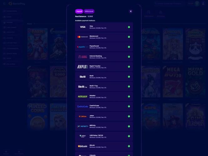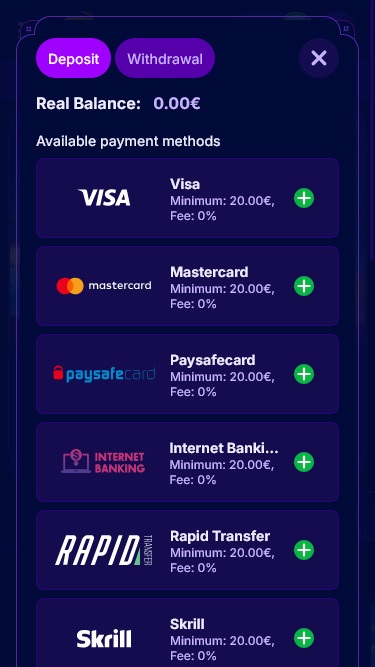 至于支付方式,该品牌允许用户使用各种银行选项存入和提取资金。一些标准选项包括Visa 、 Mastercard 、银行电汇、 Paysafecard 、 MiFinity 、 Jeton 、 Neteller等。