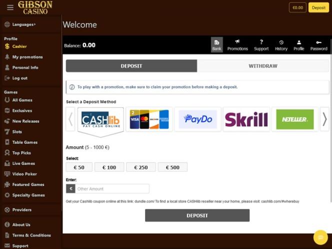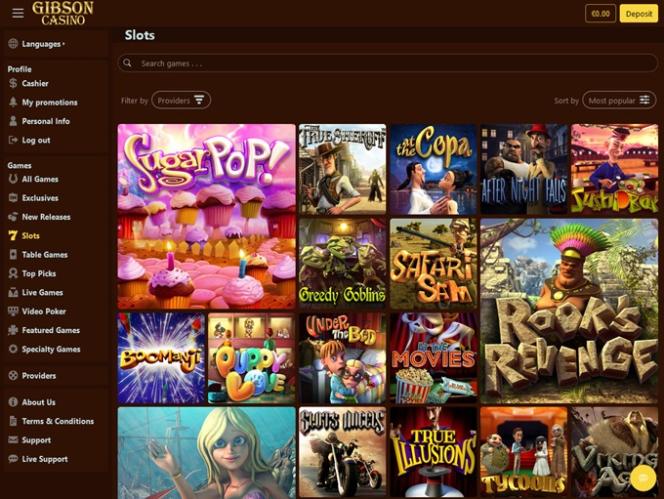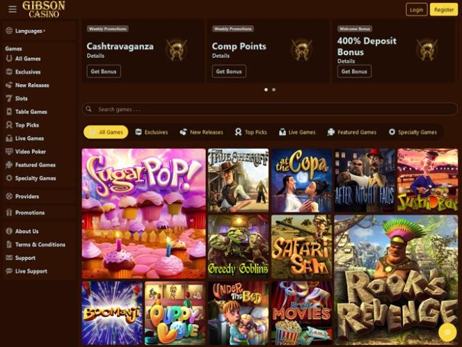Gibson Casino 由 Genesis Gaming, Rival, Vivo Gaming, Arrows Edge, Radi8 Games, Fresh Deck Studios, Woohoo Games, Qora Games, Genii, Dragon Gaming and Dragoon Soft提供支持,该软件允许通过可下载软件和基于网络的平台访问赌场。