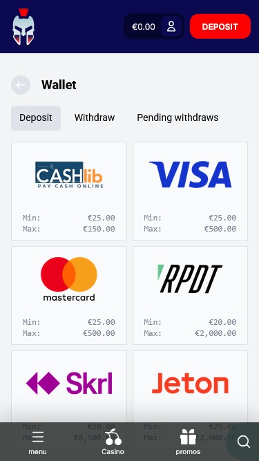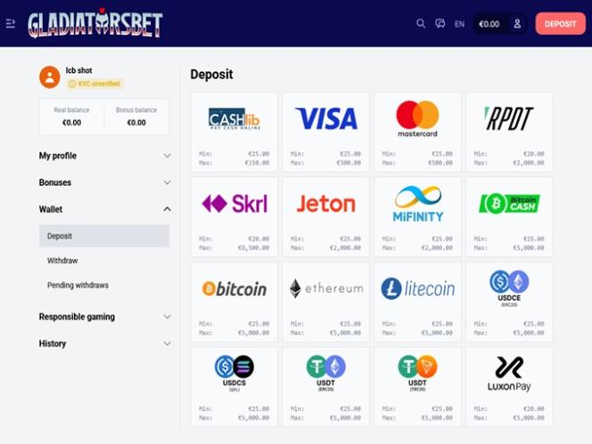 赌场可以拒绝开户或关闭现有账户,而无需说明理由。 GladiatorsBet 有权在不作任何解释的情况下拒绝接受存款。 如果账户在指定时间内未登录或未注销,则该账户将变为不活跃/休眠状态,只要账户余额为正,就会产生月费。 该平台接受多种不同的支付方式 ,让大多数玩家都能轻松找到自己喜欢的支付方式。