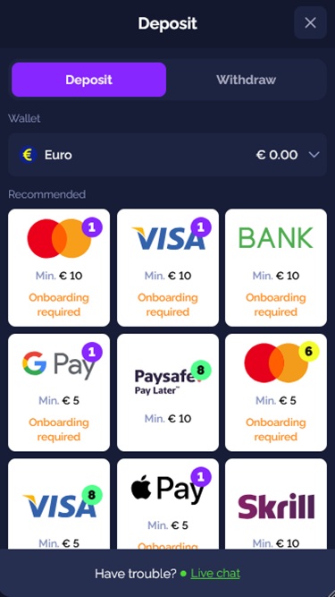 您可以使用多种付款方式在赌场账户中存取资金,例如Visa 、 Mastercard 、银行电汇、 Apple Pay 、 Google Pay 、 Skrill 、 Neteller 、 Paysafecard和MuchBetter 。遗憾的是,截至撰写本文时,该赌场尚不接受任何形式的加密货币。