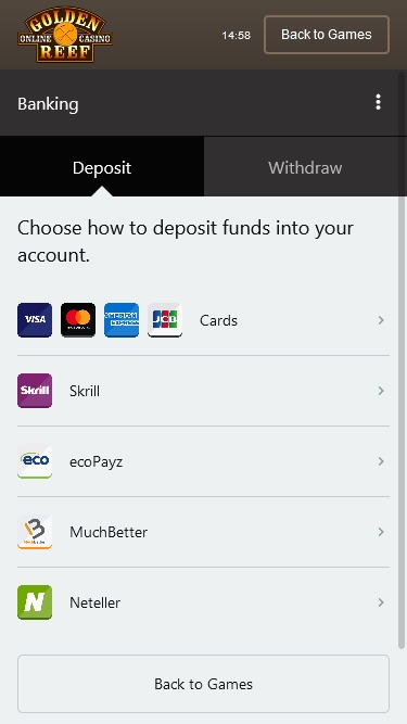 Golden Reef 赌场由 Microgaming, Evolution Gaming, Rabcat, Triple Edge Studios, Northern Lights Gaming, Stormcraft Studios, Switch Studios, Electric Elephant Games, All41 Studios, Gameburger Studios, Pulse 8 Studios, Neon Valley Studios, Real Dealer Studios, GONG Gaming, On Air Entertainment, Buck Stakes Entertainment, Games Global, Old Skool Studios, Foxium, Just For The Win, PearFiction Studios, Slingshot Studios, Fortune Factory Studios, Crazy Tooth Studio, Alchemy Gaming, Snowborn Games, Gold Coin Studios, Half Pixel Studios, Eurostar Studios, Aurum Signature Studios and Area Vegas提供支持,为玩家提供丰富的游戏选择和卓越的平台。您可以通过可下载的软件或即时游戏平台访问赌场,后者允许您直接通过网页浏览器进行游戏。Baccarat