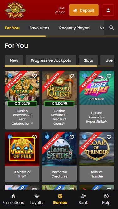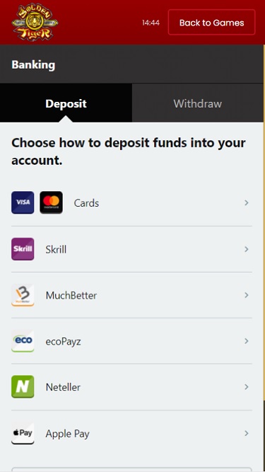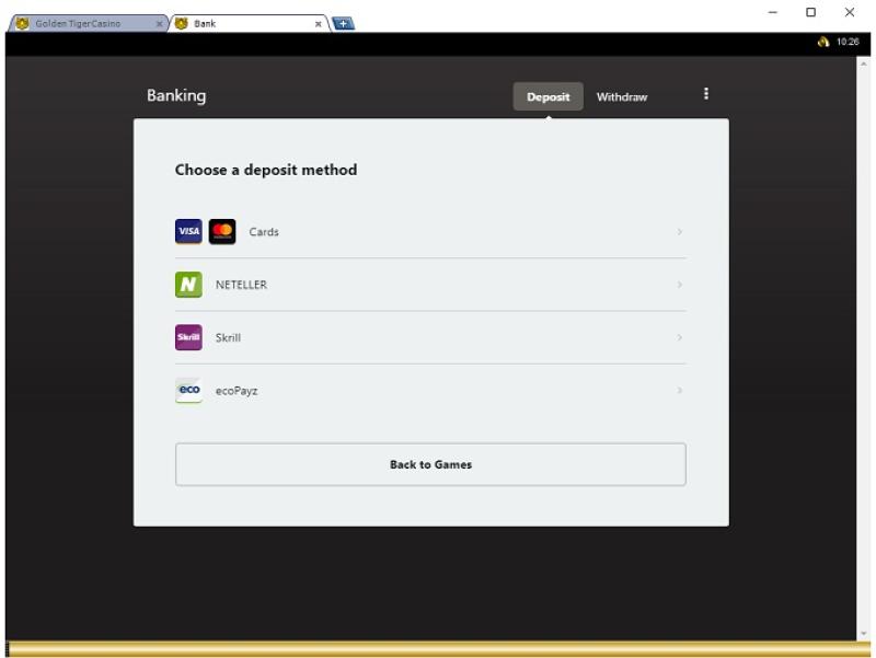Golden Tiger Casino 由 Microgaming, Evolution Gaming, Rabcat, Triple Edge Studios, Northern Lights Gaming, Stormcraft Studios, Switch Studios, Electric Elephant Games, All41 Studios, Gameburger Studios, Pulse 8 Studios, Neon Valley Studios, SpinPlay Games, Real Dealer Studios, GONG Gaming, On Air Entertainment, Buck Stakes Entertainment, Games Global, Old Skool Studios, Foxium, Just For The Win, PearFiction Studios, Slingshot Studios, Fortune Factory Studios, Crazy Tooth Studio, Alchemy Gaming, Snowborn Games, Gold Coin Studios, Half Pixel Studios, Eurostar Studios and Aurum Signature Studios提供支持,这使得其能够提供数百款游戏。该赌场为玩家提供卓越的网页和移动平台,以及可下载的版本,可将游戏存储在您的电脑上。Baccarat