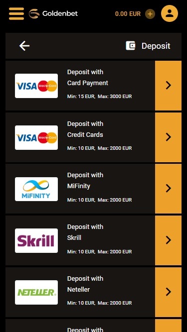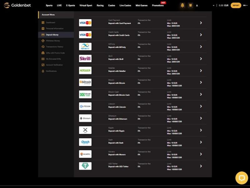 加密货币具有高度的隐私性,越来越多的赌徒发现加密货币支付方式非常适合在线赌场,因为这类交易速度非常快,而且通常手续费较低。除了加密货币,Goldenbet Casino 还提供其他热门支付方式。