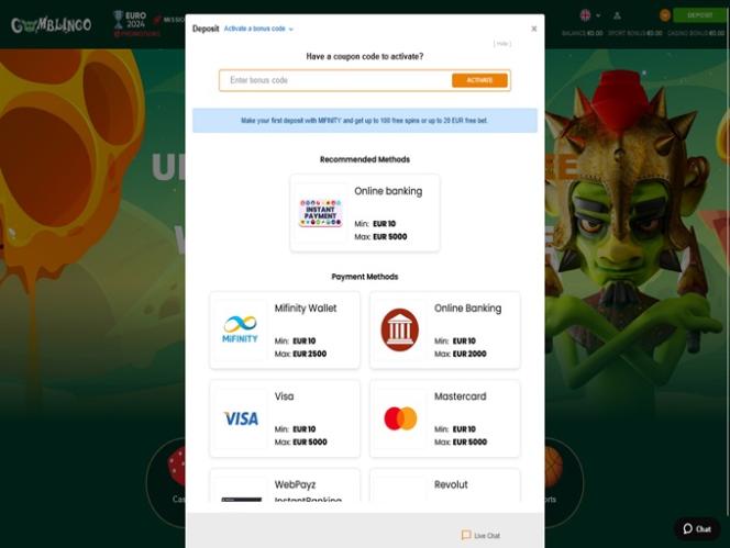 Banking银⾏业务选项 的 Gomblingo Casino
