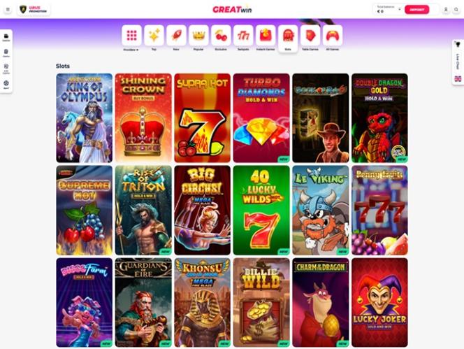 GREATwin 赌场的设计简洁明了,细节之处也引人入胜。一切都井然有序,诱人的游戏内容占据了整个网站的中心位置。
