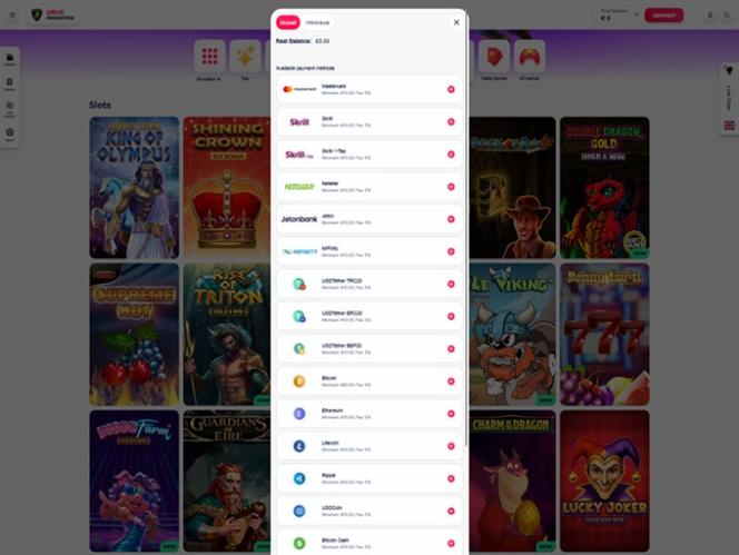 “收银员”部分提供了赌博管辖范围内可用的各种支付选择,包括加密银行方式、预付卡、信用卡和借记卡、电子钱包、即时银行转账……