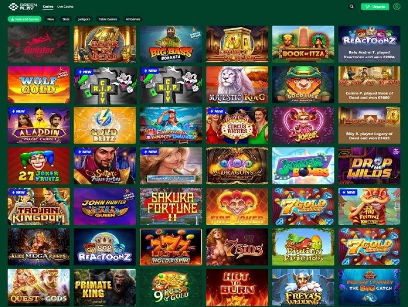 Greenplay 的游戏类别包括:特色游戏、新游戏、老虎机、累积奖金、桌面游戏和所有游戏。