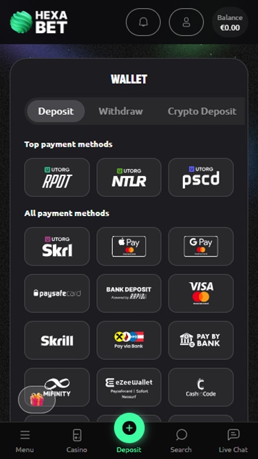 这家赌场为用户提供多种银行提款和存款选项。使用标准支付方式的用户可以选择Visa 、 Mastercard 、 Neteller 、 Paysafecard 、 Skrill 、 Neosurf 、 MiFinity 、 Google Pay和Apple Pay 。比特币、卡尔达诺、狗狗币、波卡、以太坊、莱特币、 Solana 、 Tether和瑞波币等加密货币也是可行的选择,它们提供更快、更匿名的提现,且手续费极低甚至为零。