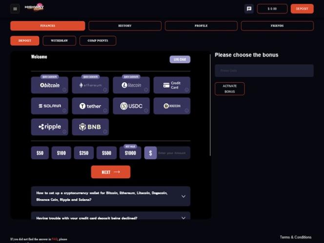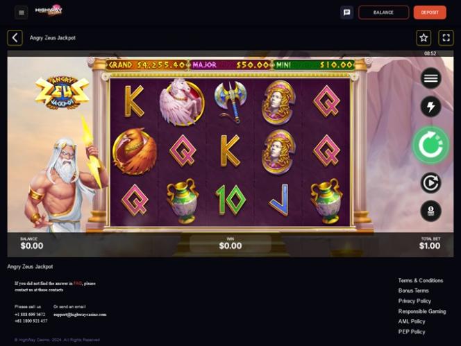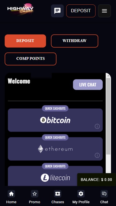 Highway Casino 由 Real Time Gaming, BetSoft, Rival, Saucify, Visionary iGaming, Betgames, Nucleus Gaming, Spadegaming, BGAMING, Genii, Wager Gaming, Dragon Gaming, FastSpin, Dragoon Soft and Urgent Games提供支持,所有游戏均可通过您的网络浏览器访问。网站界面美观,易于浏览,并设有搜索栏,方便您查找特定游戏。Highway Casino 也完全支持移动端游戏,您可以根据需要在手机或平板电脑上畅玩。