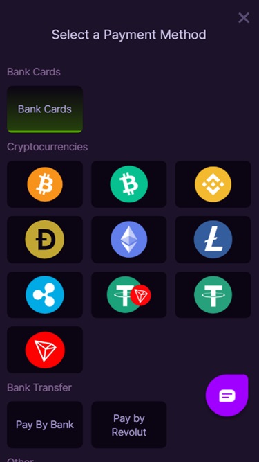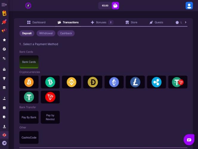 Hit Me Bet Casino 主要以加密货币为主,这意味着玩家可以使用多种加密货币进行存款和取款。支持的货币包括比特币、比特币现金、狗狗币、以太坊、波场币、泰达币和瑞波币。此外,该网站也接受传统的银行转账方式,例如银行电汇、 Revolut和Interac 。