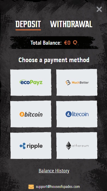 尽管 House Of Spades 赌场的出纳员依赖于各个国家/地区,但无论您来自哪个赌博管辖区,它都支持各种支付方式,包括加密货币银行选项。