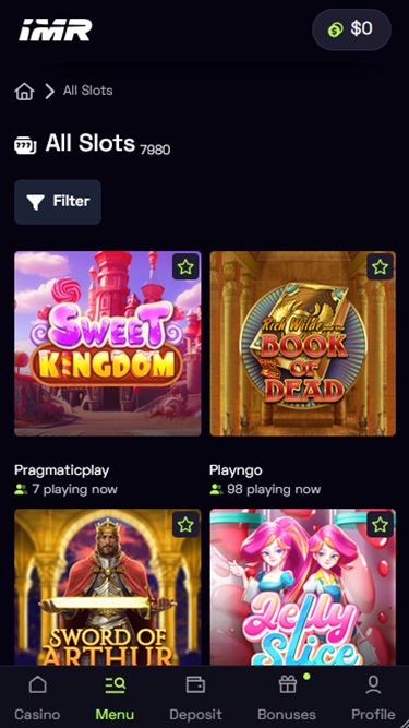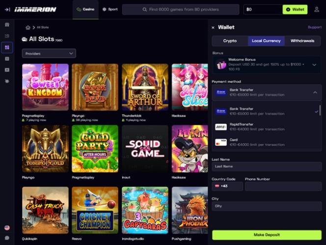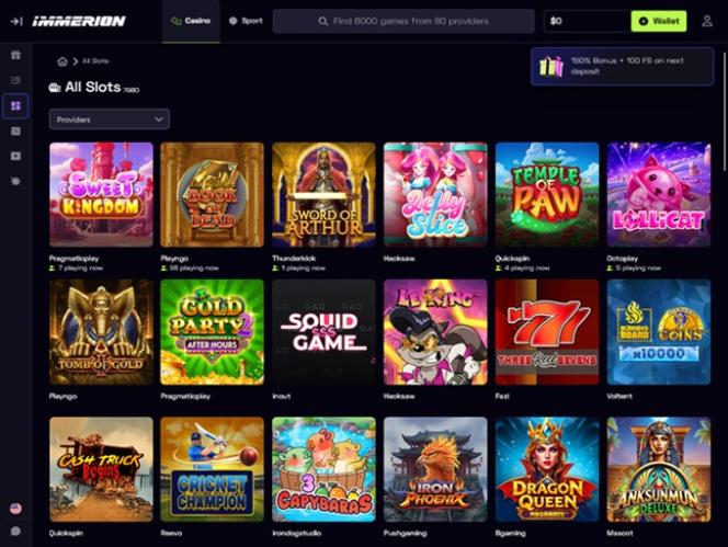 Immerion 赌场根据现代赌徒的期望精心挑选游戏库。在这里,玩家可以体验由领先软件工作室和知名 iGaming 公司(例如BetSoft、NetEnt、Quickspin以及众多其他知名在线博彩品牌)设计的游戏。此外,其合作公司名单中还包括一些新兴的创新开发商,这确保了游戏的多样性。