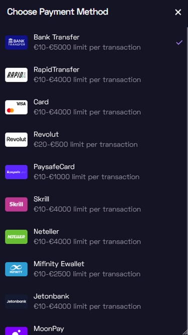 赌场收银员支持传统支付和加密货币支付。丰富的银行支付方式包括电子钱包、借记卡、信用卡等。存款和取款支持多种法定货币和加密货币,例如比特币、比特币现金、狗狗币、以太坊、泰达币、莱特币以及其他热门货币。
