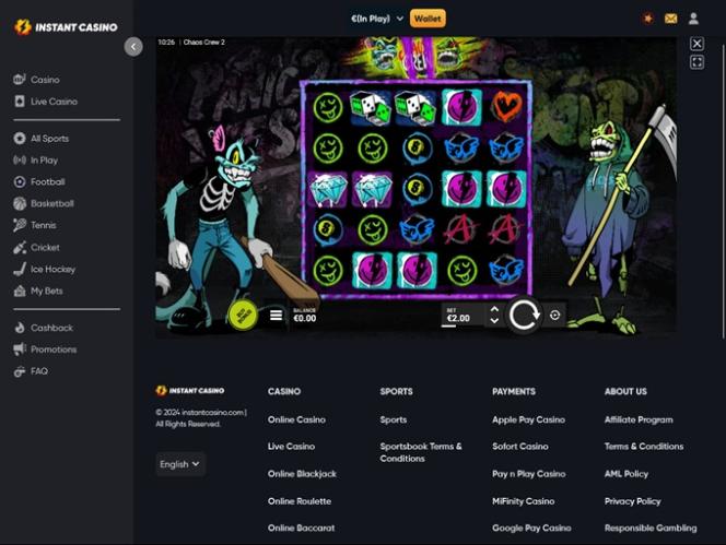 Instant Casino 是一家由库拉索博彩管理委员会 (Curacao Gaming Control Board) 授权和监管的在线赌场和体育博彩网站。该 iGaming 品牌主要面向英国、加拿大、荷兰、德国、瑞典和意大利的玩家,其平台支持阿拉伯语、德语、希腊语、英语、西班牙语、芬兰语、法语、印尼语和其他几种世界语言,是国际玩家的绝佳选择。