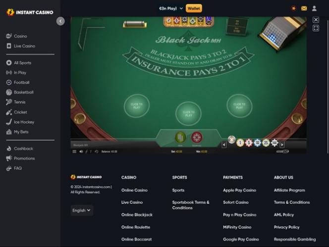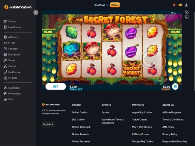 除了引人入胜的老虎机、真人游戏和桌面游戏之外,Instant Casino 还提供丰富的体育博彩选择,包括足球、篮球、网球、板球、冰球等多种体育项目。这家赌场会及时更新体育赛事比分、世界联赛和赛事信息。