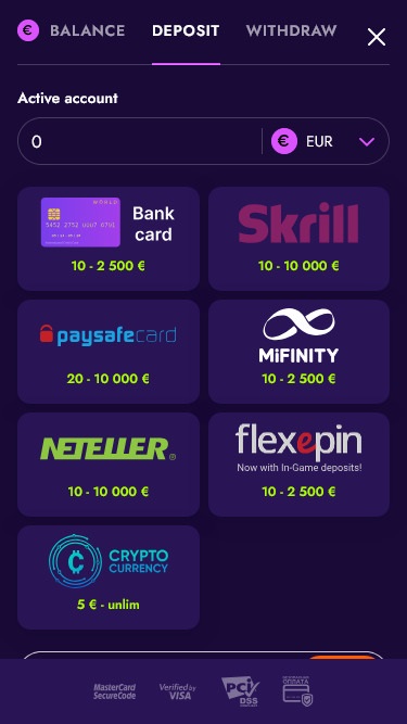 Irwin Casino 为玩家提供自由选择的支付方式,该品牌同时接受传统和现代支付方式。一些传统支付方式包括Visa 、 Mastercard 、 Skrill 、 Neteller 、 MiFinity 、 Paysafecard 、Apple Pay 和 Google Pay。而现代支付方式则包括比特币、比特币现金、狗狗币、以太坊、莱特币、 Toncoin 、 Tether 、 USD Coin 、 Tron和瑞波币等加密货币。