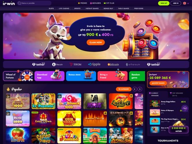 Irwin Casino 于 2024 年上线,是一个现代化的博彩网站,为玩家提供丰富的选择,包括真钱老虎机、桌面游戏、真人荷官、速成游戏,甚至还有独立的体育博彩板块。除了提供丰富的促销活动、奖金、锦标赛和 VIP 计划外,该品牌还接受各种加密货币作为有效支付方式。