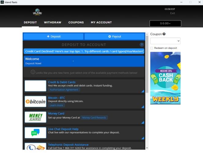 比特币银行选项、支付卡和电汇是 Island Reels Casino 提供的账户资金解决方案。