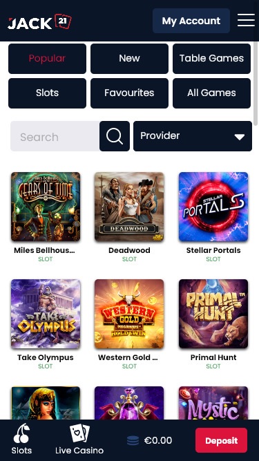 Jack21 赌场由 Microgaming, Net Entertainment, BetSoft, 1x2gaming, Big Time Gaming, ELK Studios, Evolution Gaming, Ezugi, Genesis Gaming, Habanero Systems, iSoftBet, Oryx, Play'n GO, playson, Quickspin, Rabcat, Relax Gaming, Thunderkick, Vivo Gaming, Yggdrasil, Endorphina, Wazdan, GameArt, Betgames, Booming Games, Pragmatic Play, Nolimit City, Red Tiger Gaming, Spinomenal, Fugaso, Kalamba, Triple Edge Studios, Northern Lights Gaming, Evoplay, Stormcraft Studios, Switch Studios, OneTouch, Pocket Games Soft, Triple PG, All41 Studios, Gameburger Studios, Pulse 8 Studios, Neon Valley Studios, Golden Rock Studios, SpinPlay Games, Caleta Gaming, Games Global, Amusnet Interactive, Wizard Games, 2by2 Gaming, Blueprint Gaming, Pariplay, Push Gaming, Tom Horn Gaming, Gamomat, Xplosive Slots, Reel Time Gaming, BF Games, betiXon, HollywoodTV, Ganapati, Iron Dog Studio, Old Skool Studios, Foxium, Just For The Win, Slingshot Studios, Fortune Factory Studios, 4ThePlayer, AvatarUX, SlotVision, Alchemy Gaming, Snowborn Games, Hacksaw Gaming, Half Pixel Studios, Eurostar Studios and PlayAce提供支持,并使用网页平台分发游戏。网站设计精良,浏览方便,我可以轻松找到自己想玩的游戏。Jack21 内置移动端支持,方便您通过智能手机或平板电脑进行游戏。