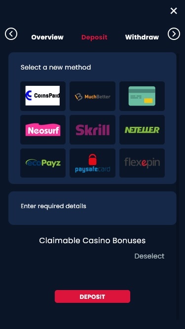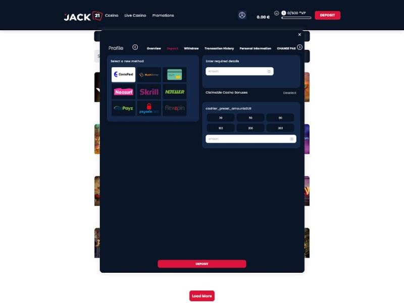 在这里您可以找到 Jack21Casino 提供的不同银行业务选项,包括存款和取款选项。