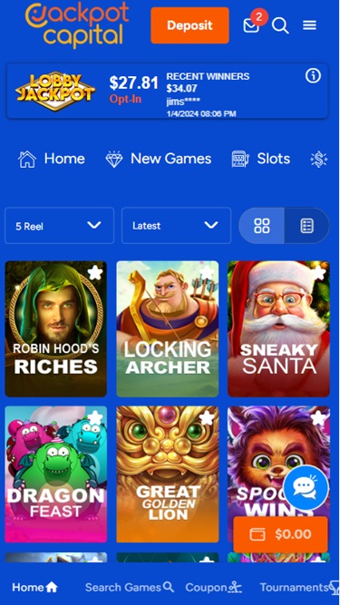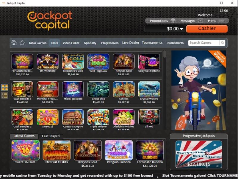 Jackpot Capital 赌场由 Real Time Gaming and Visionary iGaming提供支持,为玩家提供数十款适合美国玩家的游戏。该赌场提供网页平台以及可下载的软件,方便您将所有赌场游戏下载到电脑上。