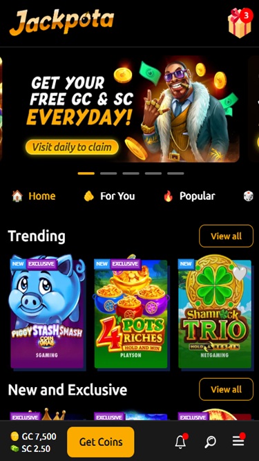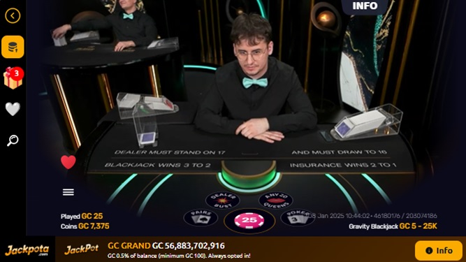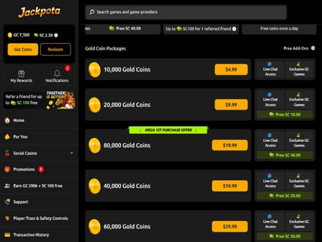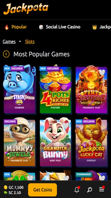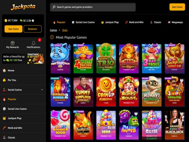 Jackpota 是一个社交和抽奖博彩网站,为玩家提供丰富的赌场类游戏库,例如在线老虎机、真人荷官和 Slingo 游戏。该游戏平台提供丰富的每日促销、累积奖金、活动和赠品,玩家无需购买即可免费参与。