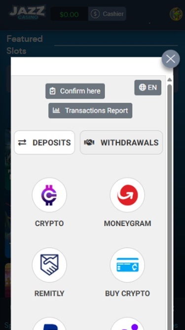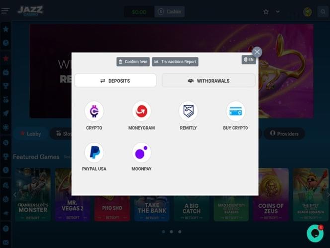 下面您将看到 Jazz Casino 的不同银行业务选项,包括存款和取款选项。
