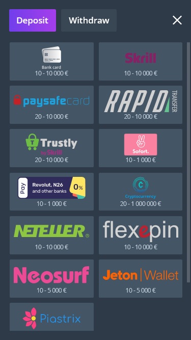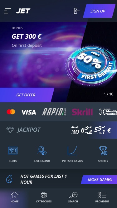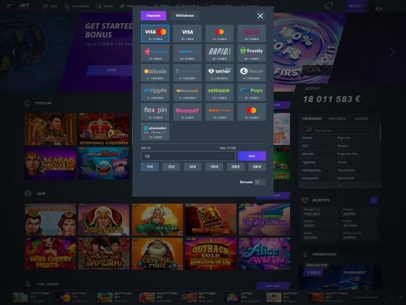 Jet Casino 提供多种支付方式,包括支付卡、电子钱包、移动交易和各种加密货币支付方式。