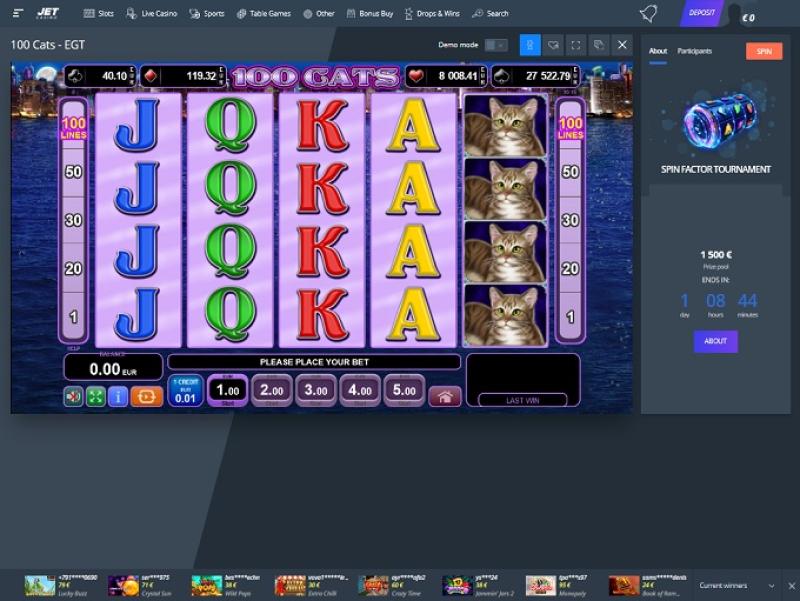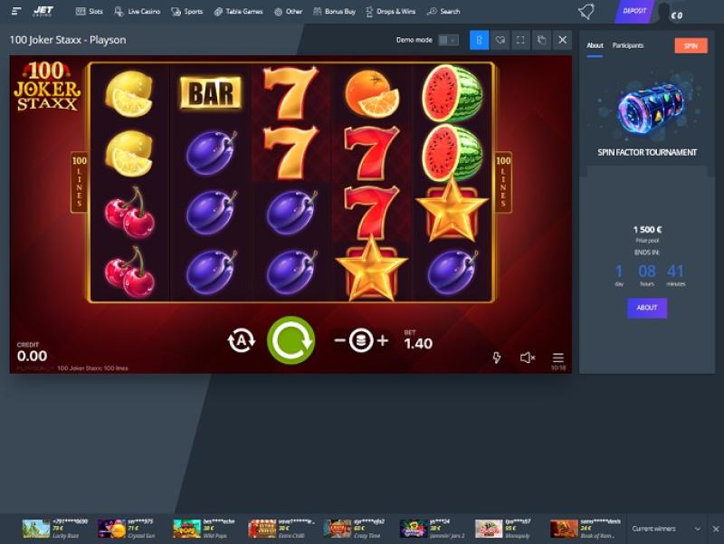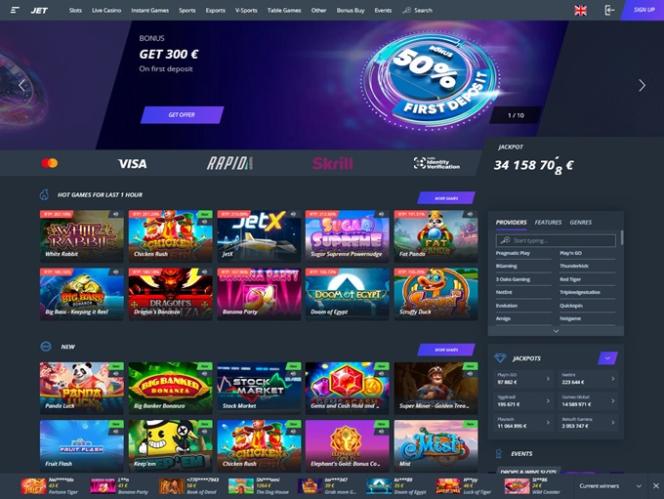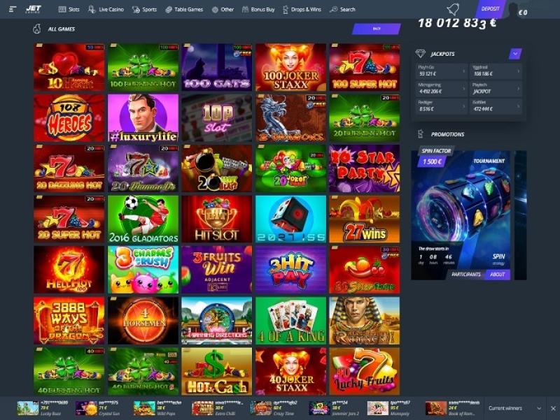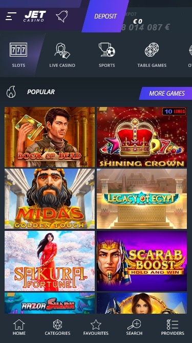 Jet 赌场提供多种老虎机游戏:Shining Crown、Midas Golden Touch、Supreme Hot、Book of Dead、Iron Bank、Sakura Fortune、Legacy of Dead、Temple Tumble Megaways、Wild Harlequin、Greta Goes Wild、Razor Shark、10 Burning Heart、Sun of Egypt 2、Valley Of The Gods、Burning Hot、Million Dracula、Rich Wilde and the Tome of Madness、Lucky Streak 2、Huge Catch、Lucky Dama Muerta、Braindead、Jammin' Jars 2、100 Burning Hot、Pimped、Ultimate Hot、100 Super Hot、Fire Joker 和 Hit the Gold! Hold and Win、Dinopolis、27 Wins、Van der Wilde and the Outlaws、Mongol Treasure、Money Train 2、Wild Toro II、Evil Goblins、50 Amazons' Battle、Book of Santa、Minotaurus、Esqueleto Explosivo 2、Rise of Merlin、Book of Horror、Lucky 100 Bells 等等。