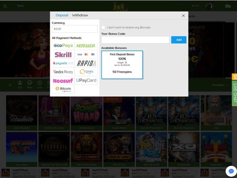 除了标准的赌场游戏外,JetSpin 还为客户提供真人荷官赌场以及比特币游戏。