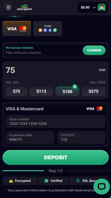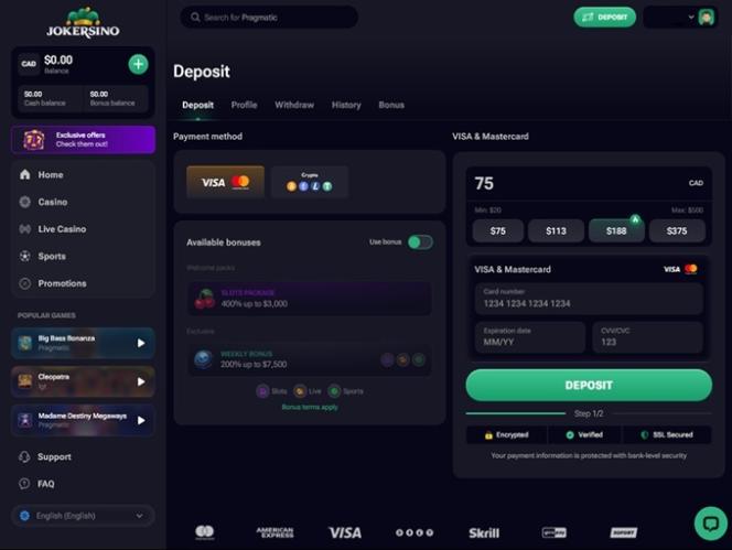 正如我们之前提到的,Jokersino 将玩家安全放在首位。赌场实施了高级别的安全措施,包括最新的安全套接字层 (SSL) 加密协议。这种数据保护措施可确保所有敏感信息免受任何未经授权的访问,从而让玩家在进行现场支付交易时安心无虞。