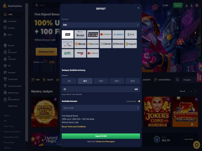 Joo 的银行系统非常可靠,网站支持通过比特币、Zimpler、Paysafecard、Visa、MasterCard、Maestro、Skrill、Neteller、Sofort 等多种方式进行存款和取款。赌场支付奖金非常迅速,比特币几乎可以立即到账,而其他电子钱包则会在 24 小时内到账。每周奖金提现限额为 4,000 美元,即 4 比特币,目前这一限额正逐渐高于其他方式的 4,000 美元限额。
