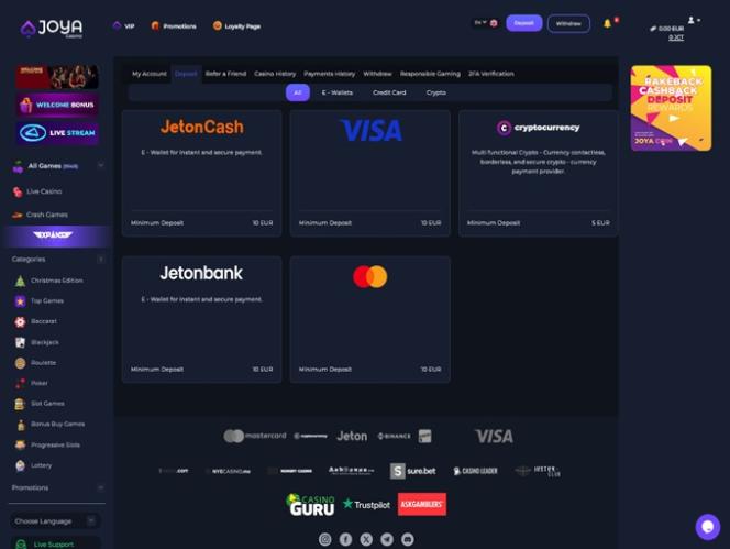 Joya Casino 由库拉索博彩管理局 (Curacao Gaming Authority) 授权并监管。该品牌目前接受来自德国、加拿大和芬兰的玩家。