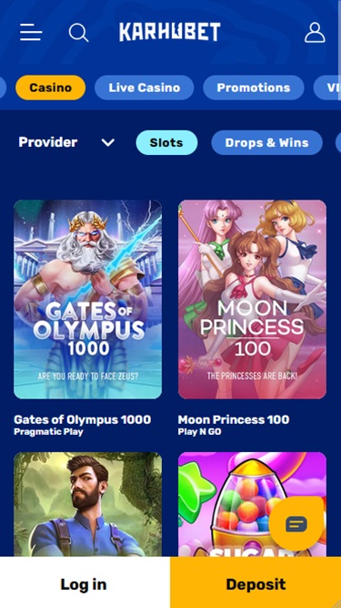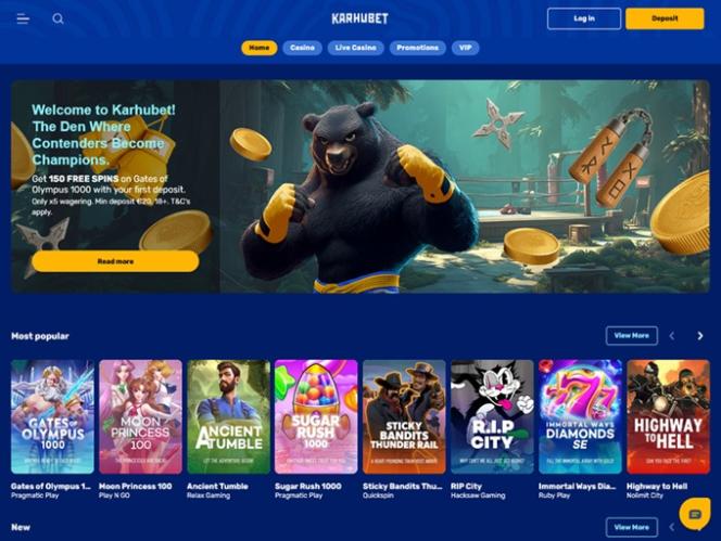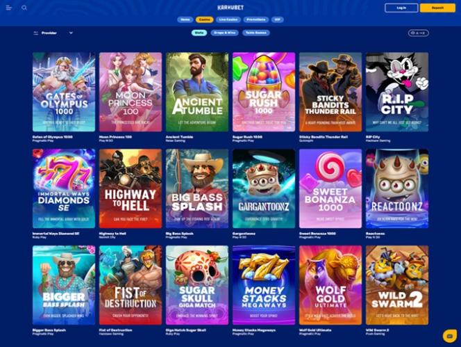 这个网站看起来很漂亮。它采用了赏心悦目的配色方案,以鲜艳的蓝色和黄色为主色调,游戏缩略图也制作精美。左侧的主菜单可以帮助您轻松浏览各项功能,包括赌场、真人赌场、优惠活动和VIP专区。接下来,让我们一起来看看KarhuBet为赌场会员提供的游戏库、其他功能和服务。