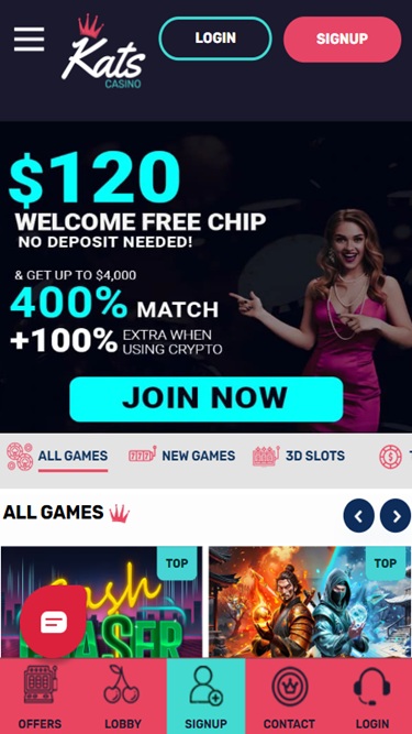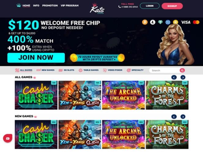 Kats Casino 是一家由 Spinlogic 和 Real Time Gaming 提供支持的小型赌场。运营商的游戏库并不丰富,也不提供真人荷官游戏,但有一些值得关注的热门在线赌场游戏,玩家可以尝试练习或真钱模式进行游戏。