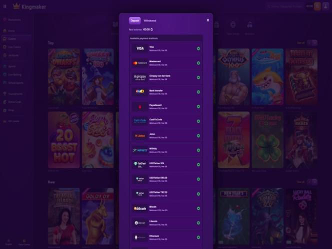 这是 Kingmaker Casino 所不具备的,因为您可以使用各种传统和现代支付方式。首先,您可以选择使用各种信用卡和电子钱包,例如Visa 、 Mastercard 、 Jeton 、 Neteller等。此外,您还可以使用各种加密货币,例如比特币、莱特币、狗狗币等。