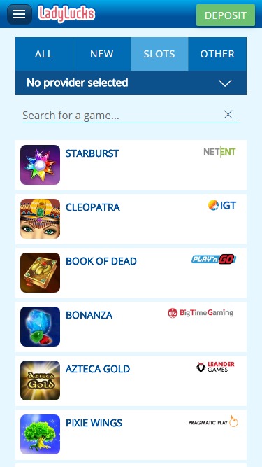 LadyLucks 赌场由 Microgaming, Net Entertainment, Barcrest, Big Time Gaming, ELK Studios, Genesis Gaming, lightningboxgames, Novomatic, Play'n GO, Quickspin, Rabcat, Relax Gaming, Thunderkick, Yggdrasil, Pragmatic Play, Felt Gaming, Red Tiger Gaming, IGT, FUGA Gaming, Games Global, 2by2 Gaming, Bally Technologies, Leander Games, Merkur Gaming, NextGen, Push Gaming, WMS, CORE Gaming, Scientific Games, Foxium, Betdigital and Just For The Win提供支持,其游戏通过移动友好的网页平台提供。iPad 和 iPhone 专用应用程序可在 App Store 下载。