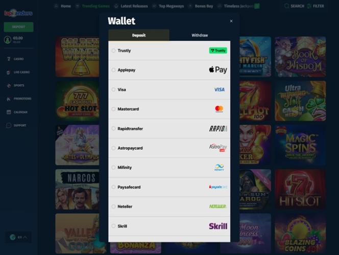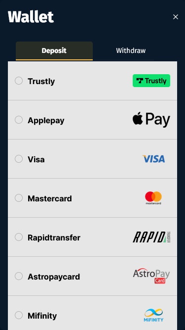 单击左侧菜单中的存款或余额按钮将加载赌场会员可用的多种付款方式。