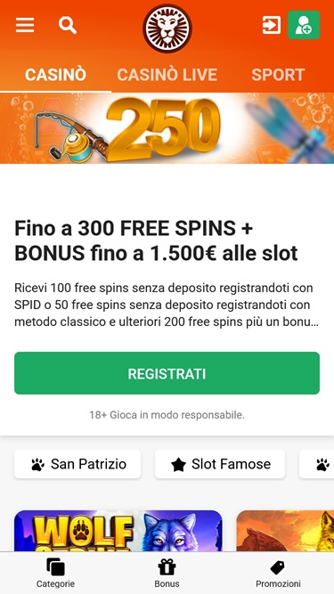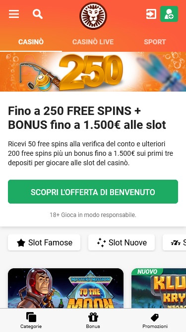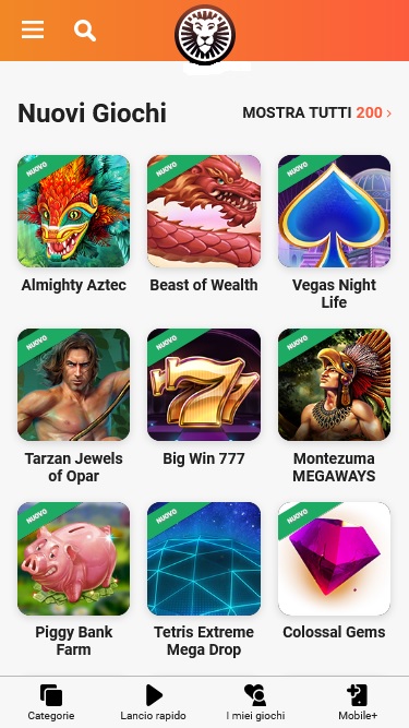 LeoVegas.it 赌场由 Microgaming, Net Entertainment, Playtech, 1x2gaming, Big Time Gaming, ELK Studios, Evolution Gaming, lightningboxgames, Novomatic, Play'n GO, Relax Gaming, Thunderkick, Pragmatic Play, Northern Lights Gaming, SpinPlay Games, Games Global, Blueprint Gaming, Greentube, NextGen, WMS, Red7Mobile, Side City Studios, Authentic Gaming, Iron Dog Studio, Foxium, Just For The Win, PearFiction Studios, Wild Streak Gaming, Alchemy Gaming, Rarestone Gaming, Snowborn Games, Area Vegas and Light & Wonder提供支持,其游戏通过基于网页的即时游戏平台提供,可直接通过您的网络浏览器加载,无需下载繁琐的软件。该网站还支持移动端游戏,您可以在智能手机或平板电脑上进行投注。