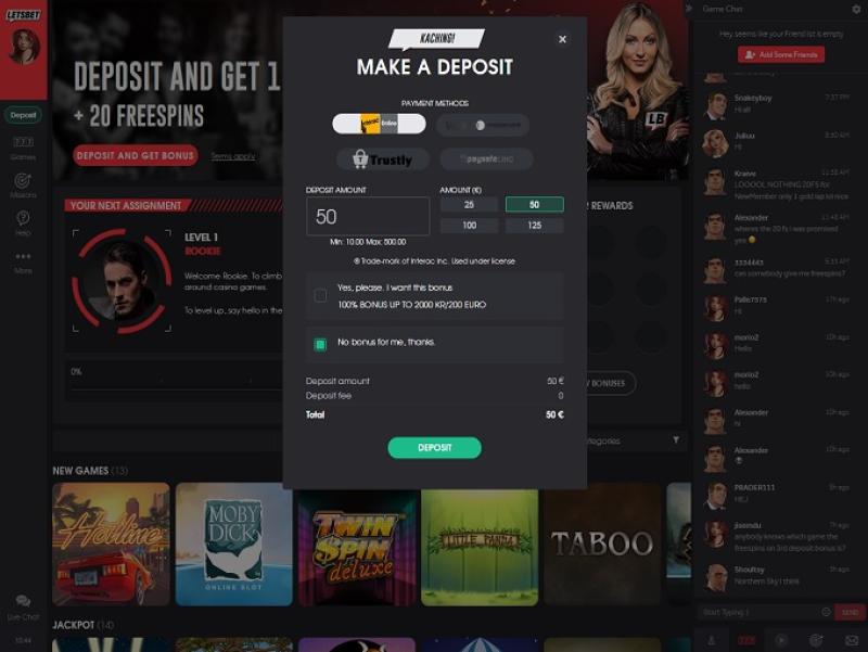 Letsbet Casino 是一家在线博彩网站,成立于 2018 年,由 Bethard Group Limited 运营。网站采用霹雳娇娃 (Charlie's Angels) 风格,首页上有三个性感尤物。赌场本身就令人印象深刻,拥有海量游戏、真人主持人和各种“任务”,助您赢取额外奖励。Letsbet 是一个引人入胜的网站,是我们长期以来评测过的优秀网站之一,如果您正在寻找新的博彩网站,那么它绝对是您的理想之选。