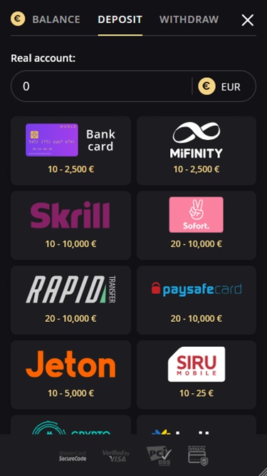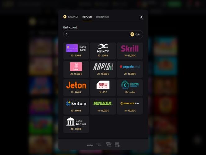 LEX Casino 允许用户使用传统和现代银行方式进行存款和取款。传统方式包括Visa 、 Mastercard 、 Apple Pay 、 Neteller 、 Skrill 、 Jeton 、 MiFinity等电子钱包和信用卡,以及银行电汇。该网站还接受比特币、比特币现金、狗狗币、以太坊、波场币、瑞波币、泰达币和莱特币等加密货币。