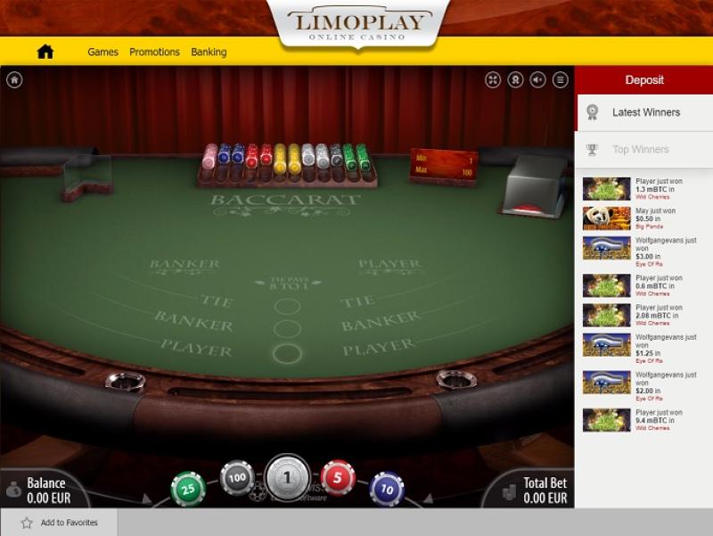LimoPlay Casino 由 Microgaming, Net Entertainment, BetSoft, Amatic Industries, Genesis Gaming, iSoftBet, Quickspin, Rabcat, SOFTSWISS, Endorphina, GameArt, Booming Games, Games Global, Amusnet Interactive, 2by2 Gaming, bluberi and NextGen提供支持,其游戏通过基于网络的平台提供。Baccarat