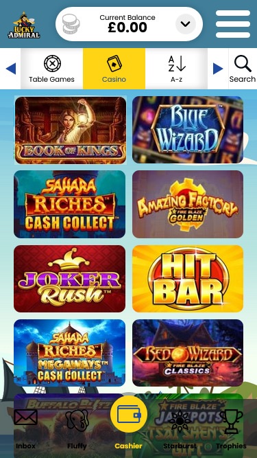 Lucky Admiral Casino 由 Microgaming, Net Entertainment, Playtech, 1x2gaming, Barcrest, Big Time Gaming, ELK Studios, EYECON, lightningboxgames, Oryx, Play'n GO, playson, Quickspin, Rabcat, Saucify, Yggdrasil, Wazdan, Realistic Games, Booming Games, Pragmatic Play, Nolimit City, Red Tiger Gaming, Spinomenal, Skywind, Triple Edge Studios, Northern Lights Gaming, Stormcraft Studios, Switch Studios, Bulletproof Games, All41 Studios, Gluck Games, Gameburger Studios, Pulse 8 Studios, Slot Factory, Neon Valley Studios, Golden Rock Studios, Shuffle Master, SpinPlay Games, Real Dealer Studios, GONG Gaming, On Air Entertainment, Buck Stakes Entertainment, Games Global, 2by2 Gaming, Ainsworth, Ash Gaming, Bally Technologies, bluberi, Blueprint Gaming, Leander Games, NextGen, Tom Horn Gaming, WMS, Inspired Gaming, Gaming Realms, Genii, SG Interactive, Gamomat, Red7Mobile, Scientific Games, Reel Time Gaming, Authentic Gaming, Iron Dog Studio, Old Skool Studios, Foxium, Just For The Win, The Games Company, Storm Gaming Technology, MetaGU, PearFiction Studios, Wild Streak Gaming, Slingshot Studios, Fortune Factory Studios, Jade Rabbit Gaming, 4ThePlayer, Gamevy, Crazy Tooth Studio, ReelPlay, Alchemy Gaming, Rarestone Gaming, Snowborn Games, Boomerang Studios, Hacksaw Gaming, Max Win Gaming, Gold Coin Studios, Half Pixel Studios, Peter And Sons, Aurum Signature Studios, Lucksome Gaming, Area Vegas, RAW iGaming and Wishbone Games提供支持,其游戏通过网页即时游戏平台提供。此外,我们还提供移动网站,方便用户通过智能手机或平板电脑进行游戏。