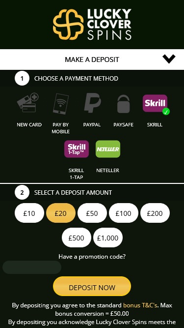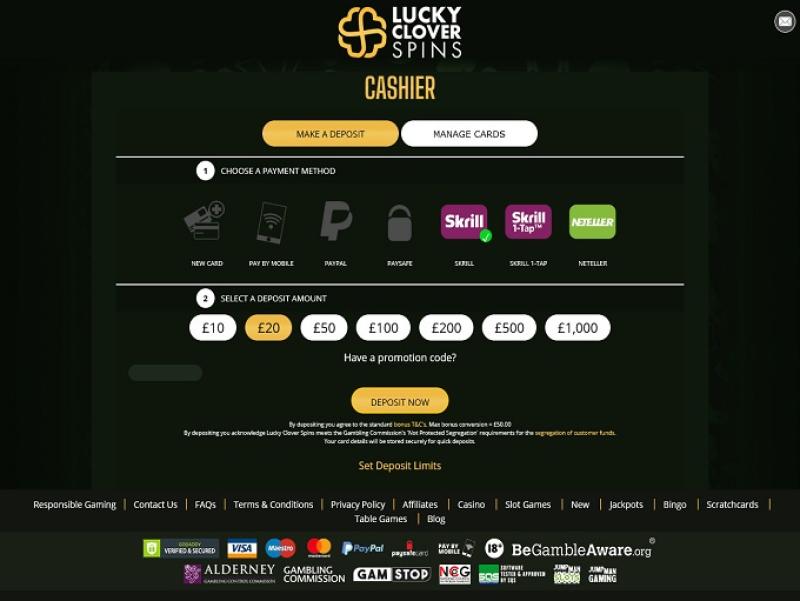 说到银行选项,您可以使用一些最受欢迎的银行卡付款,例如 Visa、Maestro、MasterCard 和 Paysafe 卡。如果您愿意,也可以通过 PayPal 付款。遗憾的是,Lucky Clover Spins Casino 不允许玩家通过加密货币存款,我们希望这种情况在未来能够改变,因为越来越多的玩家希望通过加密货币进行赌场存款。