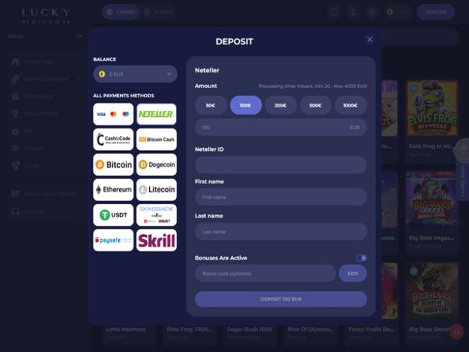 除了提供多项忠诚度奖励外,Lucky Friends 还为玩家提供一系列促销和奖金,让他们乐此不疲。首先,创建账户后,您将获得丰厚的迎新礼包,其中包含多项存款匹配优惠。