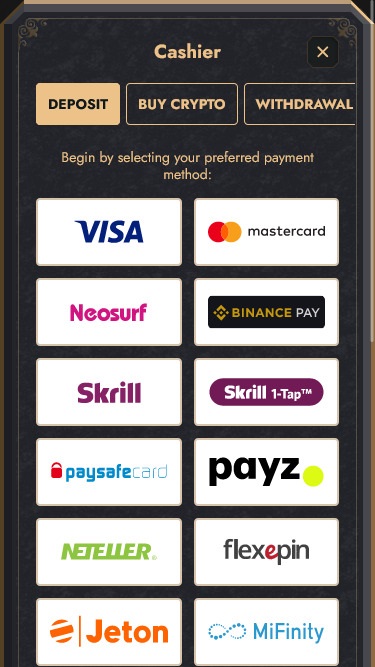 该赌场运营商为玩家提供丰富的传统支付方式,例如Visa 、 Mastercard 、 Skrill 、 Neteller 、 AstroPay和Paysafecard 。此外,玩家还可以选择使用比特币、 莱特币、 以太坊、 Tether 、 Tron 、 瑞波币、 Solana 、 狗狗币等加密货币。